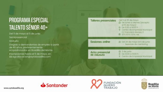 El Ayuntamiento de Boadilla del Monte pone en marcha una nueva edición del Programa Especial Talento Sénior 40+, una iniciativa dirigida a demandantes de empleo de 40 años o más, preferentemente empadronados en Boadilla del Monte.