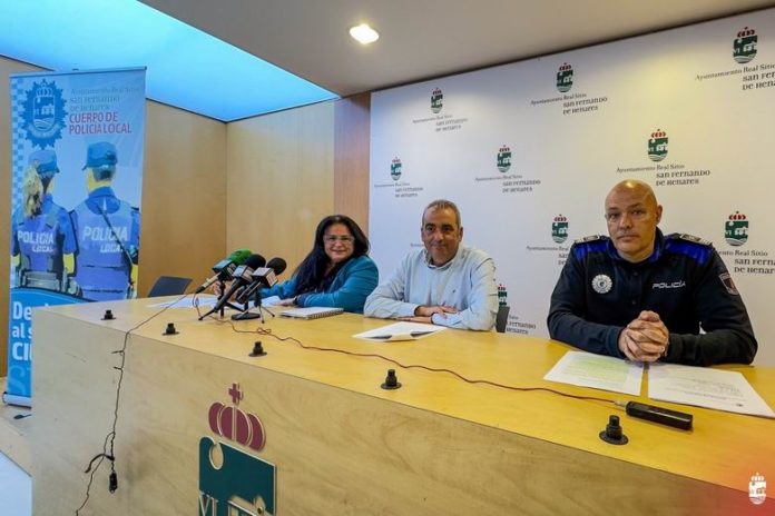 El alcalde de San Fernando de Henares, Javier Corpa; y la concejala de Seguridad, Movilidad y Emergencias, Leticia Martín; junto al inspector jefe de Policía Local, Ismael García; han presentado hoy últimas actuaciones emprendidas, como la reciente instalación y puesta en funcionamiento de 72 cámaras de videovigilancia divididas en: