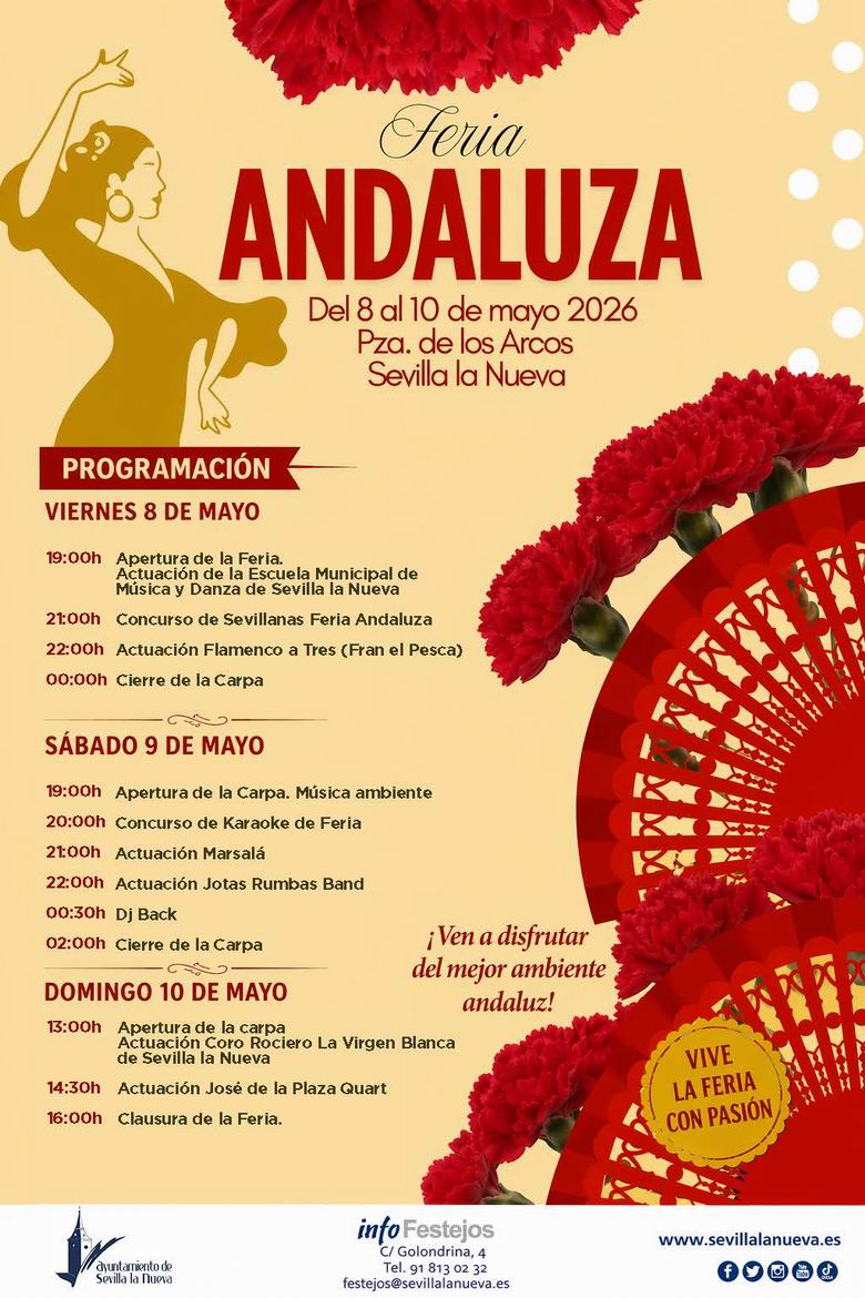 El Ayuntamiento de Sevilla la Nueva presenta una nueva edición de la Feria Andaluza, que tendrá lugar del 8 al 10 de mayo en la Plaza de los Arcos.